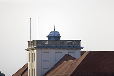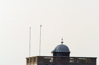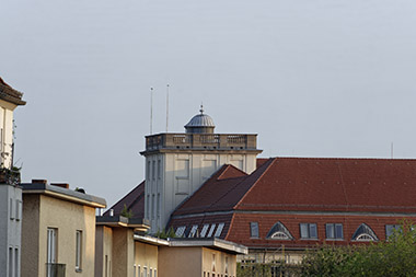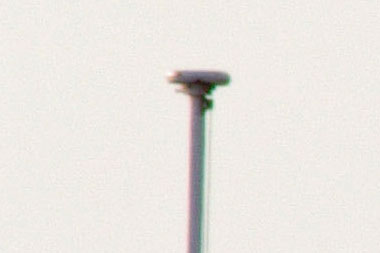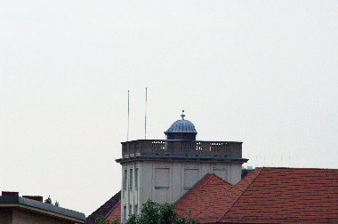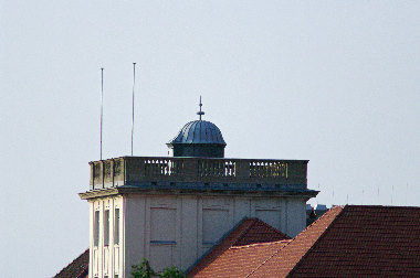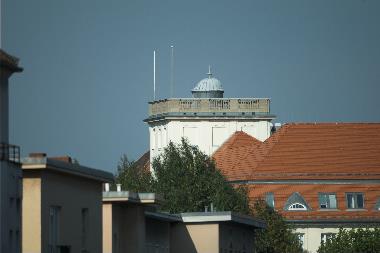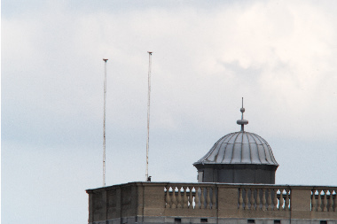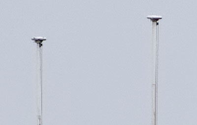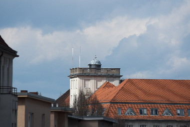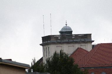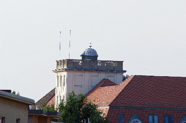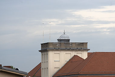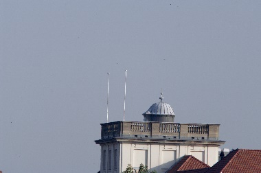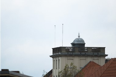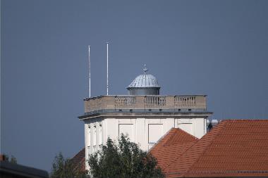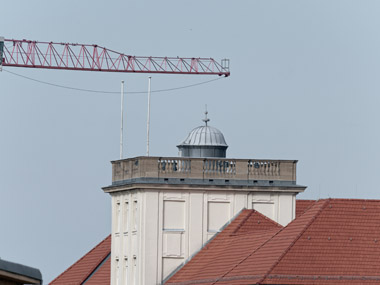 Seit einigen Jahren teste ich lange Brennweiten am selben Motiv. In ca. 550 Meter Entfernung vom Aufnahmesstandpunkt (mein Balkon) befindet sich eine große Dachterrasse mit einer Kuppel und zwei Fahnenmasten.