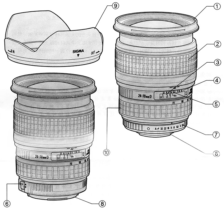 | 1. Filtergewinde | 6. Fokussierschalter (nur Sigma SA und Canon AF) |