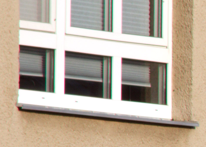 Testmotiv. Fotografiert mit 70mm Brennweite und Blende 8. Zum Vergleich sieht man nachstehend einen Auschnitt vom Fenster in der linken oberen Ecke.