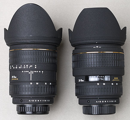 Die Bilder zeigen zwei Exemplare des Sigma EX 28-70. Links ist jeweils das ältere Objektiv zu sehen, rechts die neuere DF Variante.