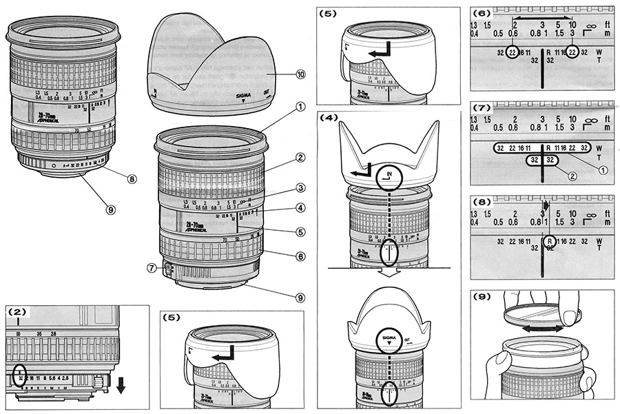 | 2. Entfernungsring | 7. Fokussierschalter (nur Sigma SA und Canon AF) |