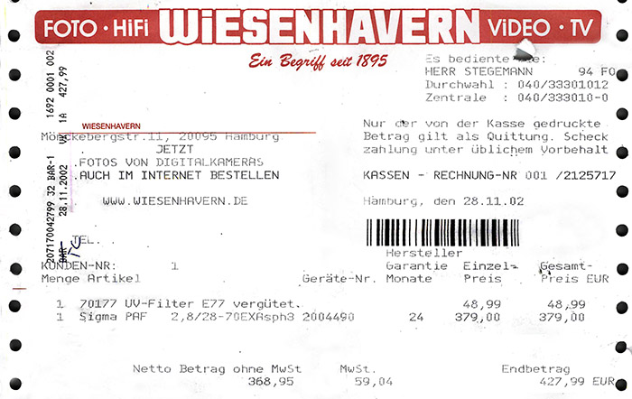Auf einer Rechnung aus dem Jahr 2002 wurde das Sigma EX 2.8/28-70mm Aspherical mit 379 € ausgewiesen.