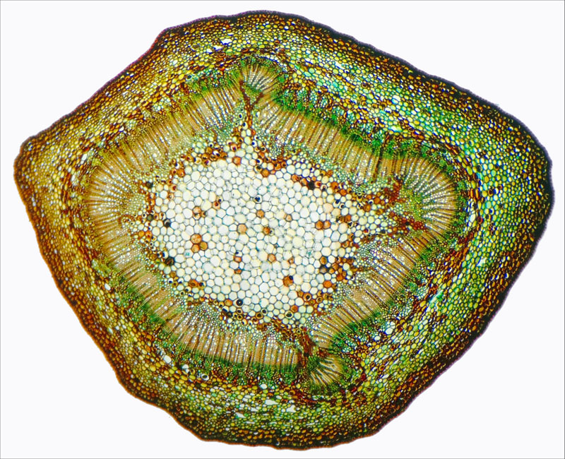 Gefärbtes Präparat. Schnitt durch einen dünnen Pflanzenstengel.