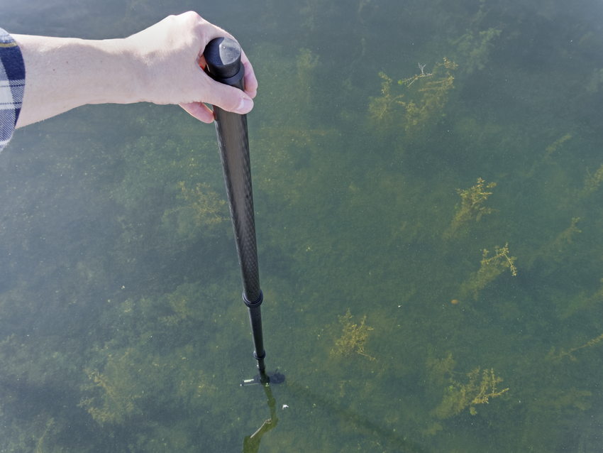 Smartphone im wasserdichten Gehäuse am B.I.G. MC-3M Monopod Carbon 3M. Damit wird es ins Wasser gesteckt.