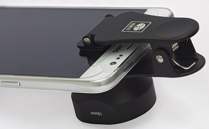 SIRUI 18-WA Weitwinkel Vorsatzobjektiv mit Clip an einem Samsung J5 Smartphone. Ein Andruckfläche presst auf das Displayglas.