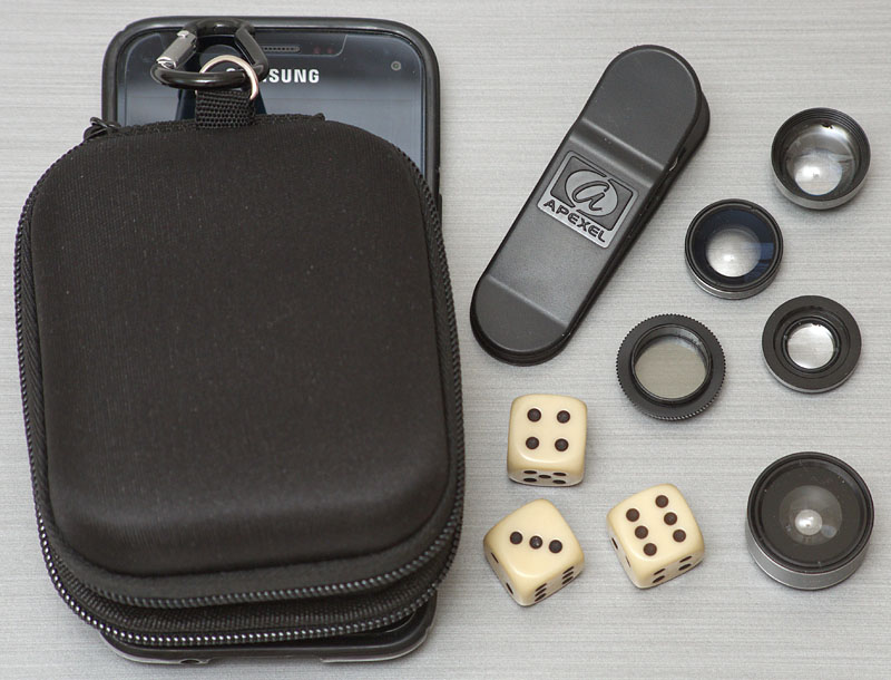 Apexel APL-DG5H Etui mit Vorsatzoptiken für das Smartphone. Die Optiken sind etwa so groß wie Würfel.