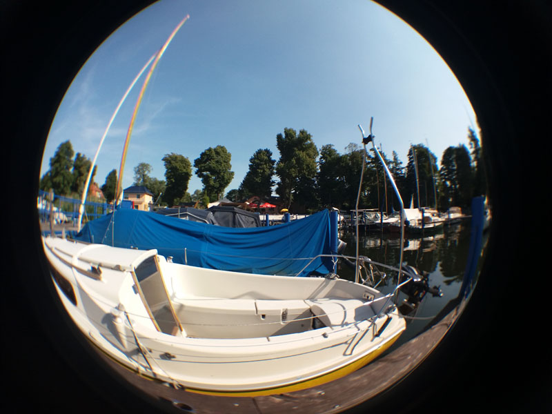Das Fischauge aus drei Linsen erzeugt ein rundes Bild. Der Kreis passt nicht vollständig in das Aufnahmeformat. Der Effekt ist interessant und es mag Situationen geben, in denen der extreme Bildwinkel des Fischauges Vorteile bringt. Im Zentrum des Kreises ist das Bild einigermaßen scharf und wird zum Rand hin immer unschärfer. (Smartphone Samsung J5)