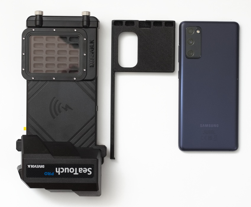 Für eine optimale Funktion müssen Smartphones korrekt und unverrückbar im Gehäuse positioniert sein. Um ihre unterschiedlichen Abmessungen zu brücksichtigen, gibt es individuelle Adapter. Sie verhindern, dass Smartphones lose hin und her rutschen. Zum Lieferumfang gehören einige für verschiedene Modelle.Prolematisch können bei diesem Konzept Schutzgläser auf Touchscreens sein, weil sie das Smartphone dicker machen und es deshalb im Gehäuse stecken bleiben kann. Deshalb rät Divevolk, Schutzgläser zu entfernen. Bei meinem Samsung S20 FE war es nicht nötig, das vom Hersteller angebrachte Schutzglas vom Touchscreen abzuziehen. Probieren Sie es einfach aus und treffen danach die Entscheidung, ob sie es dranlassen oder entfernen.
