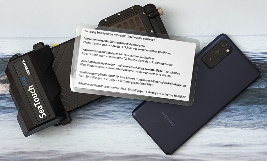 Die richtigen Einstellungen für den Betrieb des eigenen Smartphones im Unterwassergehäuse sollte man drucken, laminieren und beim Unterwassergehäuse aufbewahren. Am besten fotografiert man die Anleitung zusätzlich mit dem Smartphone, um die Anleitung auch darin zu speichern.