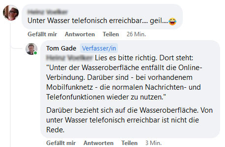 Um Mißverständnissen vorzubeugen: Es geht nur um die Nutzung der Fototechnik im Smartphone unter Wasser. Dass man dort keine Verbindung zum Mobilfunketz hat, sollte jedem klar sein. Das ist nur über Wasser im Bereich eines Mobilfunknetzes möglich.