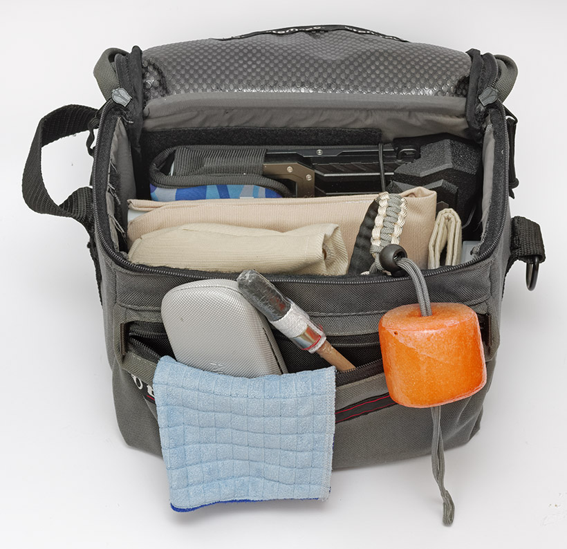 Die Teile in den Hüllen kann man gut in einer Fototasche verstauen, ohne dass sie sich gegenseitig beschädigen. Außerdem bietet die Tasche Platz, um weitere Gegenstände mitzunehmen, die im Einsatz nützlich sind: