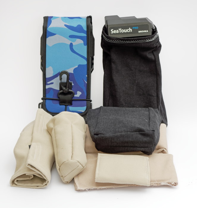 Deshalb entschloss ich mich, eine ganz normale mittelgroße Fototasche zu verwenden und für die einzelnen Teile selber Umhüllungen aus Stoff zu nähen. Passend für das Divevolk SeaTouch 3 oder 4 stellte ich einen Beutel mit zwei gepolsterten Einlagen für die Seite mit dem Scharnier und für die weiche Rückseite vor dem Touchscreen her.