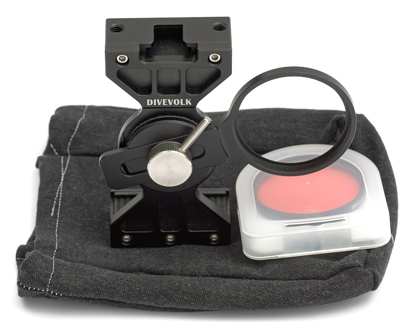 Zubehörklemme des Divevolk SeaTouch 3 Pro Gehäuses mit Orangefilter zum Kompensieren des Blaustichs unter Wasser.