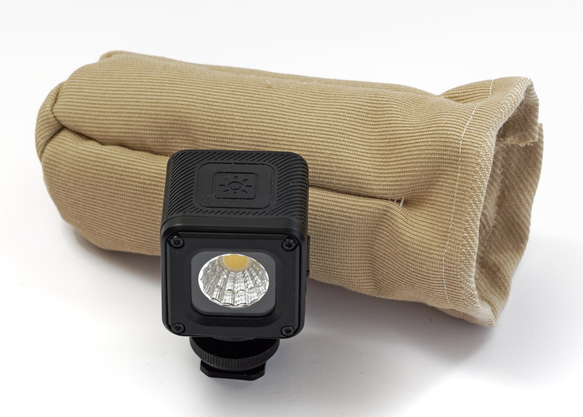 Lampe mit selbstgenähtem Beutel. Rollei Lumis Solo 2 LED Leuchte. Sie ist laut Hersteller bis 10 Meter Tiefe wasserdicht.