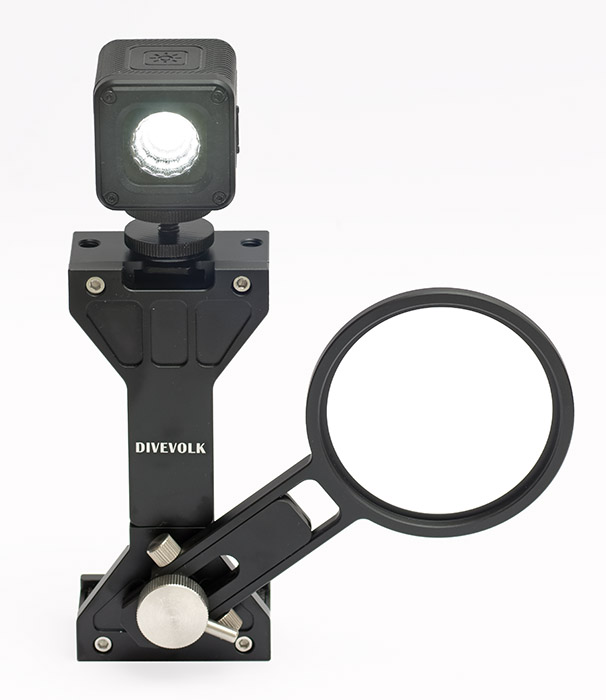 Rollei Lumis Solo 2 LED Leuchte auf der Zubehörklemme des Divevolk Seatouch 4 Max Gehäuses.