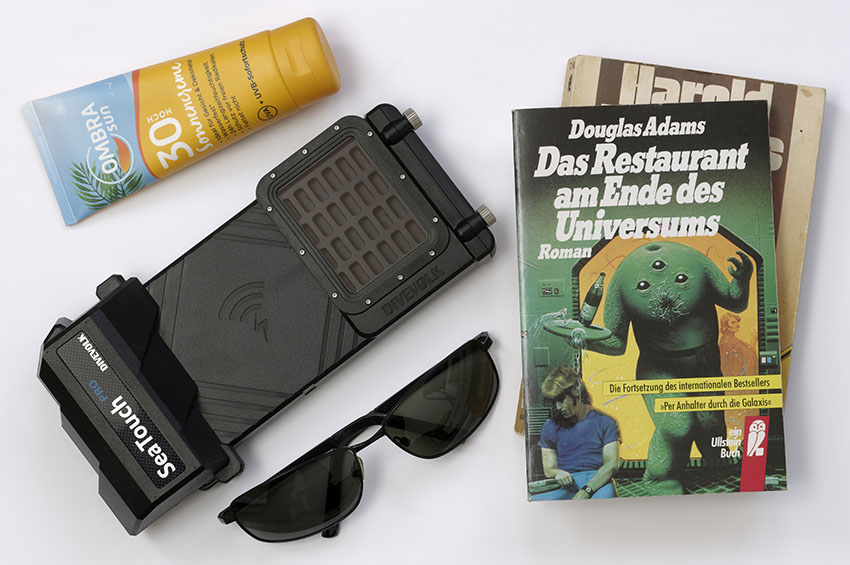 Divevolk SeaTouch 3 Pro zum Größenvergleich neben einer Sonnenbrille, Taschenbüchern und einer Tube Sonnencreme