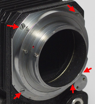 Fünf Schrauben werden entfernt, um den Halter des Kameraanschlusses zu demontieren. Achtung! Beim Abnehmen fällt eine kleine Stahlkugel, die rechts unten in dem runden kleinen Zylinder steckt, heraus. Danach wird das Exakta-Bajonet herausgedrückt und stattdessen ein gekürzter M42 Zwischenring eingesetzt. Um das M42 Gewinde in die richtige Position zu bringen, damit nach dem Ansetzen des Adapters die Kamera richtig am Balgen sitzt, werden die fünf Schrauben zur Befestigung des Halters etwas gelockert, damit es gedreht werden kann. Die kleine Stahlkugel über einen Druck auf den Rand des M42 Gewindes aus. Nach dem erneuten Anziehen der fünf Schrauben, bleibt der M42 Anschluss in seiner Position.
