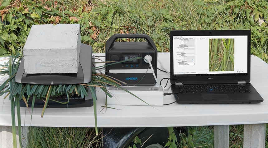 Flachbettscanner eignen sich gut, um Pflanzen zu 'fotografieren'. Die Powerstation Anker PowerHouse 521 liefert den nötigen Strom für den Epson Perfection 3200 Photo. Bei diesem Aufbau im Freien wird der Laptop von Dell von der großen Powerbank XTPower MP-50000 mit Strom gespeist, weil sie eine DC Buchse mit variabler Spannung hat, die auf 19 V, passend für das Notebook, eingestellt werden kann. Die Anker 521 braucht deshalb nur den Flachbettscanner zu versorgen. Da bei dieser Tätigkeit einige Minuten zwischen den Scans vergegen, um die Pflanzen auszutauschen, kann man mehrere Stunden draußen arbeiten.