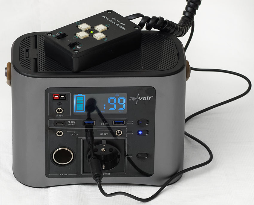 Die revolt HSG-650 Powerstation mit Li-Ion-Akkus bietet mit 333 Wh viel Strom für Teleskope und ihre Peripherie. Sie kostet derzeit 370 € (Mai 2022). Man kann alles an sie anschließen, was zur anspruchsvollen Astrofotografie nötig ist: Autoguider, Kameras, Laptops, Montierungen mit Schrittmotoren und Steuergeräten etc.