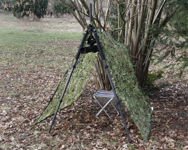 Sirui R-3213X mit Tarnnetz in der Naturfotografie. Ein Stativbein ist waagerecht nach oben geklappt und ruht am Ende in einer Astgabel. Dadurch ergibt sich die Möglichkeit, ein Tarnnetz darüber zu spannen. Die Mittelsäule steht Kopf und somit auch die Kamera.