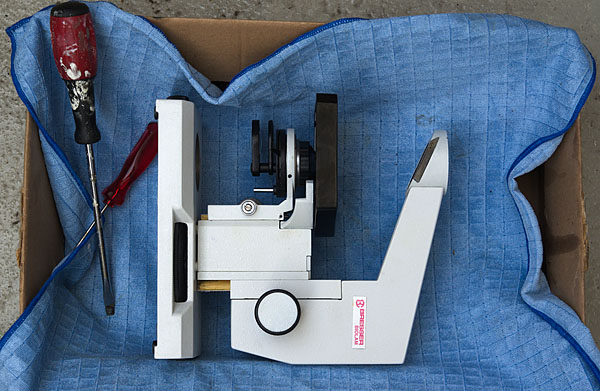Alternativ kann man das Mikroskop zerlegen, um mit kleineren Gefäßen auszukommen, jedoch gehört das Auseinandernehmen der Mechanik zur Scharfstellung nicht unbedingt zu den Kompetenzen, die man von jedem Mikroskopierer erwarten kann.