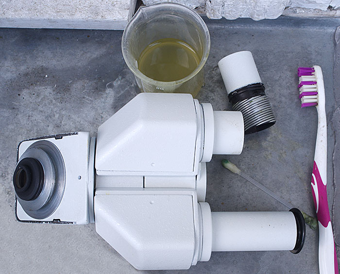 Anschließend werden die beweglichen Teile mit Nähmaschinenöl geölt und schließlich das Mikroskop äußerlich gereinigt, denn hier darf kein Öl an der Oberfläche haften, weil man es sonst auf die Finger und somit auf die Präparate und Glasoberflächen der Optiken bekommt.
