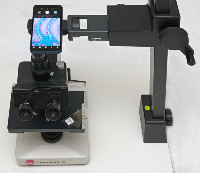 Viele Smartphones eignet sich sehr gut für die Fotografie am Mikroskop. Vorteilhaft sind Trinokulare für beidäugiges Sehen mit einem zusätzlichen optischen Ausgang zum Fotografieren. Es ragt senkrecht nach oben und das Smartphone blickt von oben hinein. Mithilfe einer Reprosäule lässt sich ein einfacher und guter Aufbau realisieren. Das Display des Smartphones bietet eine gute Bildkontrolle.© Thomas Gade