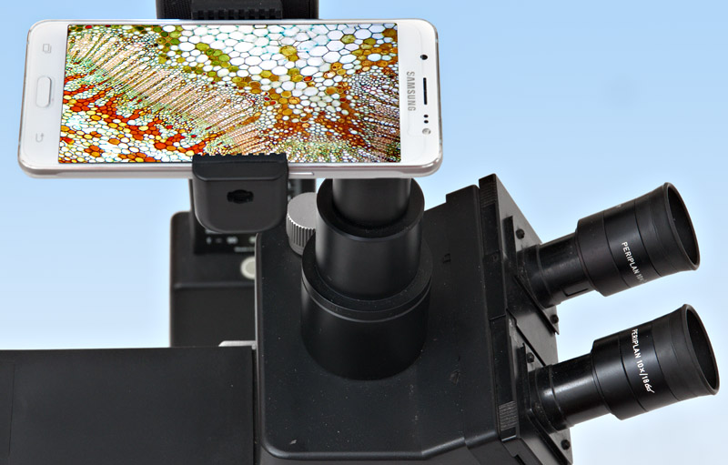 Moderne Smartphone sind sehr gut für die Fotografie am Mikroskop geeignet. Kameras mit größeren Sensoren bieten eigentlich keine Vorteile, weil das optische System eines Lichtmikroskops aus physikalischen Gründen ihre hohe Auflösung gar nicht ausreizen kann. Wie funktioniert das? Das Smartphone 'blickt' in ein Okular. Dazu muss es im richtigen Abstand und Ausrichtung positioniert werden.