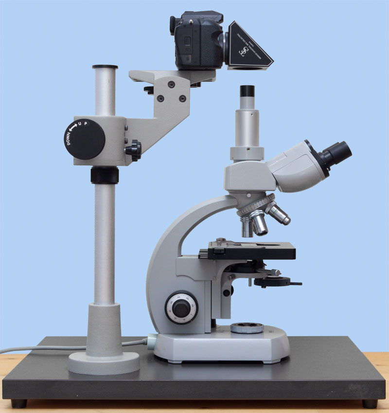 Der fototechnische Aufbau aus einem Grundbrett, auf dem das Mikroskop steht sowie ein stabiles Stativ zum Tragen der Kamera befestigt ist, ist auch in anderen Konstellationen verwendbar. Beispielsweise beim Adaptieren einer schweren DSLR an das Mikroskop. In dem Fall wäre die Umlenkung um 90° leicht mithilfe eines hoch präzisen Umlenkspiegels möglich. Es gibt sie preiswert und mit guter Möglichkeit zum Anschluss an Kameras im Astrohandel als sogenannte Zenitspiegel.In dem Fall wäre die Umlenkung um 90° leicht mithilfe eines hoch präzisen Umlenkspiegels möglich. Im Astrohandel gibt es sei preiswert (100 €) mit guter Anschlussmöglichkeit an Kameras als sogenannte Zenitspiegel. Inwieweit dies der direkten Adaption an das Mikroskop vorzuziehen ist, hängt von verschiedenen Faktoren und dem persönlichen Geschmack ab. Sicherlich gibt es auf diese Weise Potenzial, um Schwingungen zu reduzieren, die einen negativen Einfluss auf die Bildqualität haben.
