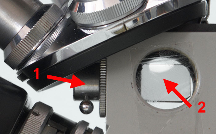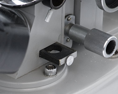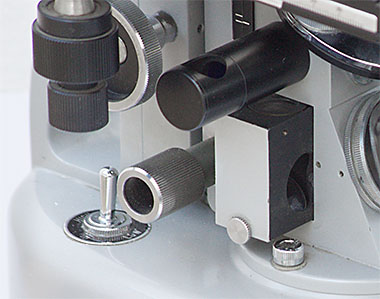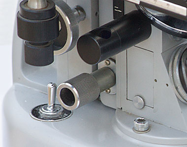 Dieses Mikroskop ist schon lange nicht mehr im Handel und nur gebraucht zu erhalten. Leider ist die anschraubbare Lampe für die Beleuchtung über dem Kreuztisch (hier also Durchlicht) nur selten zu finden. Daher lohnen sich Experimente mit alternativen Leuchtquellen. Eine starke LED Taschenlampe mit Diffuser leistet gute Dienste. Im guten Zustand, befreit vom Staub und der Patina eines langjährigen Werkstatteinsatzes, ist dieses robuste Mikroskop allemale 300 € wert. Dieses Mikroskop ist auf dem US-amerikanischen Gebrauchtmarkt (eBay.com) in verschiedenen Varianten relativ oft zu bekommen. Selten ist es komplett oder im guten Zustand. Die Preise gehen weit auseinander. Die inverse Bauweise ist sehr praktisch, weil man Proben sehr bequem auf dem Kreuztisch positionieren kann.© Thomas Gade