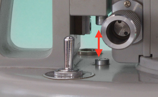 Am Trieb zur Höhenverstellung für den massiven Tisch gibt es zwei Bolzen, zwischen die man eine Feder bringen sollte, um dem Gewicht der Proben und des Kreuztisches etwas Druck entgegen zu setzen. Die passende Länge ergibt sich aus der üblichen Arbeitshöhe, die widerum vom Arbeitsabstand der Objektive abhängig ist.