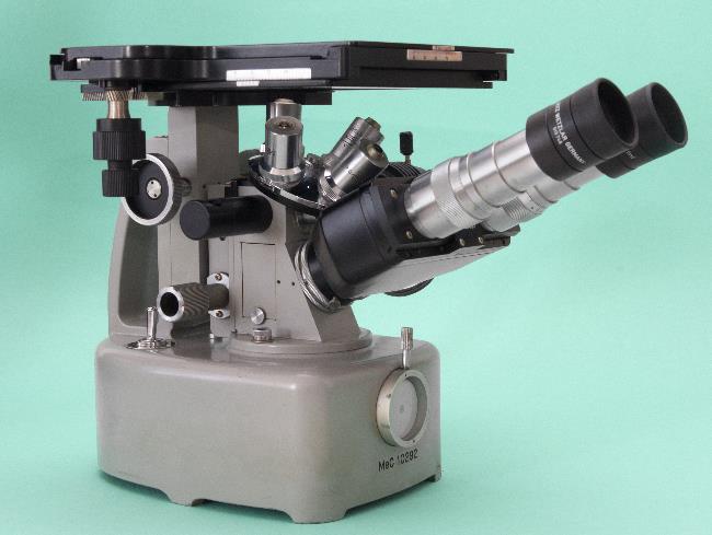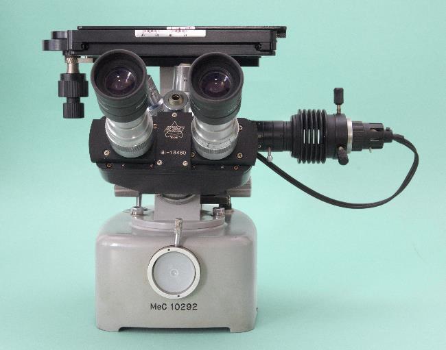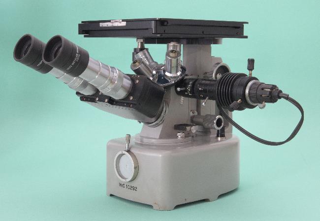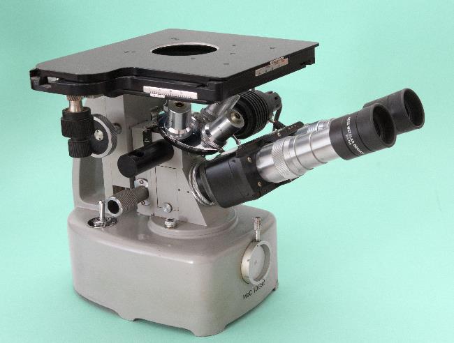 Das kompakte Unitron MeC 10292 wiegt stolze 7 kg und ist robust gebaut. Es ist für den industriellen Einsatz konzipiert. Für das Mikroskop gibt es zwei Beleuchtungsvorrichtungen, Durchlicht (hier von oben) und Auflicht (hier von unten durch das Objektiv).
