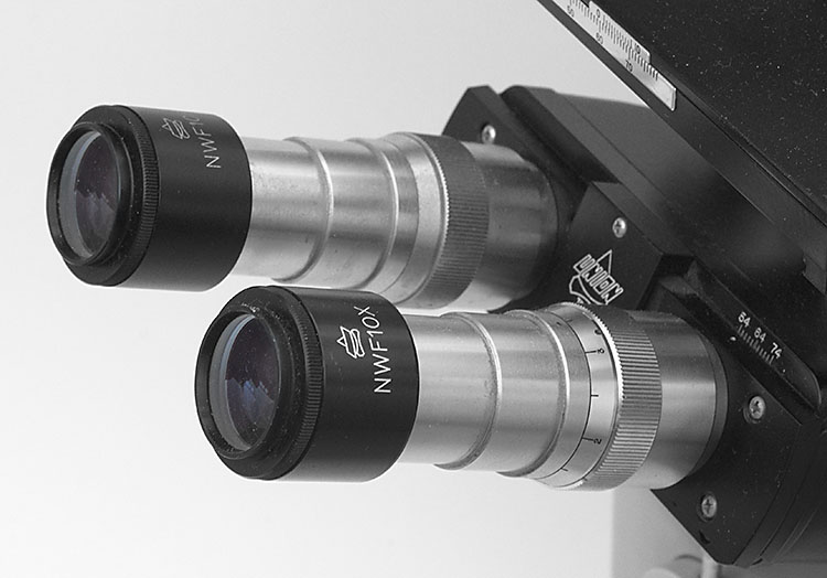 Unitron MeC 10292 inverses Mikroskop. Zwei NWF10x Okulare am Binokular, auf dem Union Tokyo steht, ein Hinweis auf den Ursprung: Olympus.