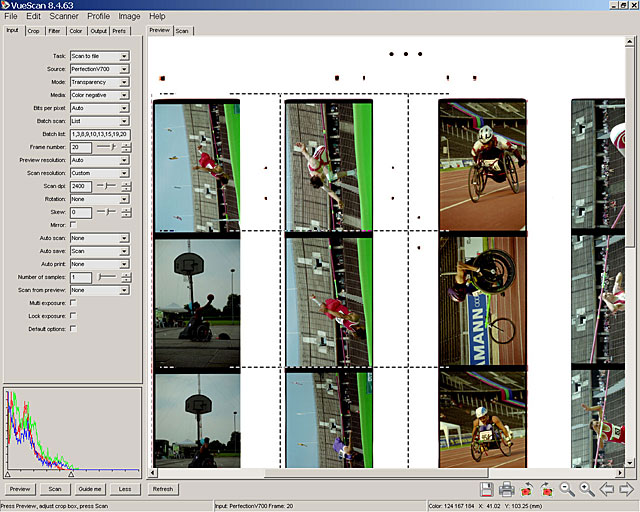 Im 'Input' Register werden im Feld 'Batch list' die Bildnummern eingetragen, die gescannt werden sollen. Die Nummern werden mit Kommata getrennt. Man zählt reihenweise von links nach rechts. In der linken Spalte sind die Bilder eins bis sechs. Die zweite Reihe beginnt oben mit dem Bild sieben. In dem hier dargestellten Beispiel sieht man in der linken Spalte drei Fotos. Sie haben die Nummern 1, 2 und 3. Die Bilder 4, 5 und 6 existieren nicht aber das obere Bild in der zweiten Spalte heißt nicht '4' sondern '7'! VueScan zählt stets alle Felder.