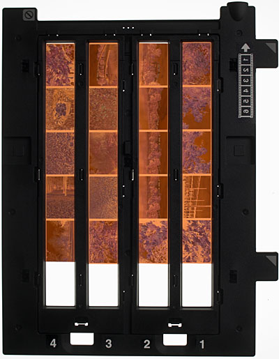 Der Filmhalter kann 4 Filmstreifen mit bis zu 6 Bildern im Format 24x36mm aufnehmen. Die Filme werden mit der Schicht (matte Seite) nach oben eingelegt. Der Scanner sieht die Bilder spiegelverkehrt. Daher werden die Filmstreifen von rechts nach links in den Filmhalter gelegt.