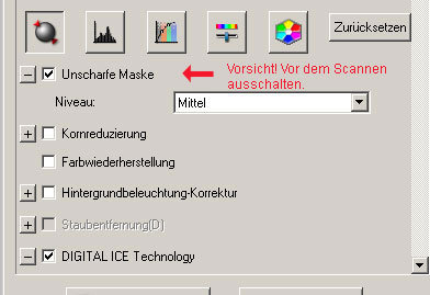 Die 'Unscharf Maskierung', eine Funktion zum Schärfen von Bilddateien, ist bei diesem Programm standardmäßig eingeschaltet. Beim Scannen von hochaufgelösten Archivdateien, die als Ursprungsmaterial für weitere Verwendungen eingesetzt werden sollen, muss die 'Unscharf Maske' deaktiviert werden, da dieser Schritt erst am Ende einer Bildbearbeitungskette stehen soll.