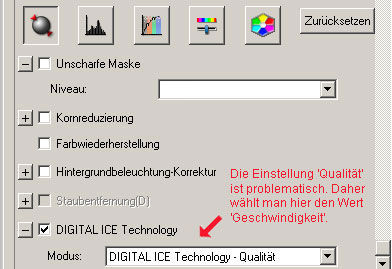 Das Programm hat eine softwareeigene Schmutz- und Kratzerbeseitigung, die unbrauchbar ist. Daneben gibt es die vom Scanner unterstützte Erkennung und Beseitigung von Defekten namens DIGITAL ICE, die mit den meisten Farbfilmen sehr gut funktioniert. Es gibt zwei ICE Stufen: Qualität und Geschwindigkeit. ICE in der Stufe Geschwindigkeit geht relativ flott und bringt gute Ergebnisse. Die Modusänderung von Digital ICE wird erst nach dem Ziehen des Scrollbuttons sichtbar. Sie steht standardmäßig auf 'Qualität' mit unerträglich langen Bearbeitungszeiten und Retuschefehlern.