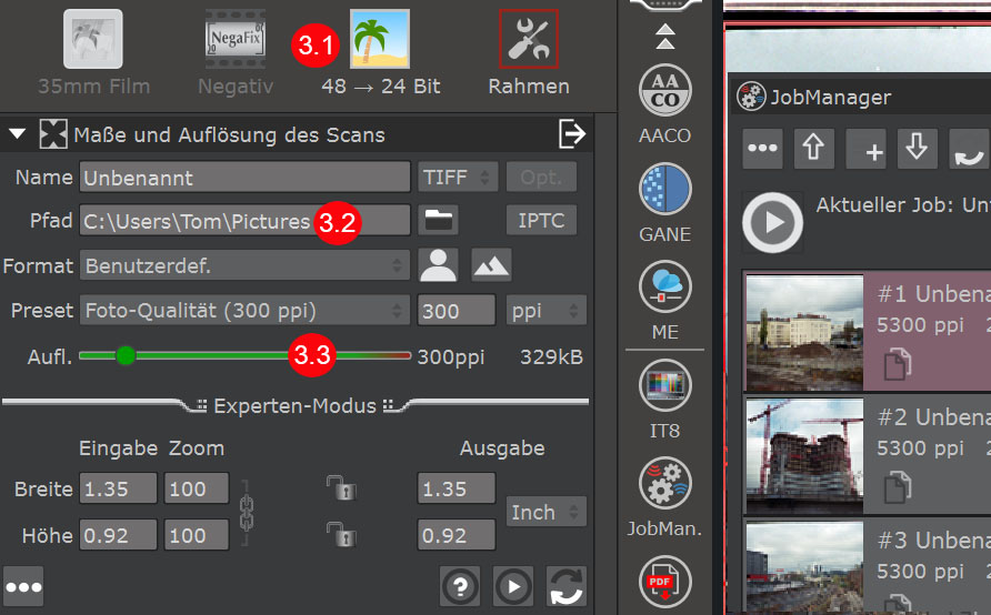 Ziel dieses Vorgang ist es, für die einzelnen Bilder genaue Einstellungen treffen zu können. Dazu gehört die individuelle Korrektur der Ausschnitts-Rahmen, die als Liste im JobManger erkennbar sind.