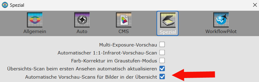 Voraussetzung dafür ist, dass Sie, wie oben bereits erwähnt, in den Einstellungen im Register Spezial einen Haken setzen bei 'Automatische Vorschau-Scans für Bilder in der Übersicht'.