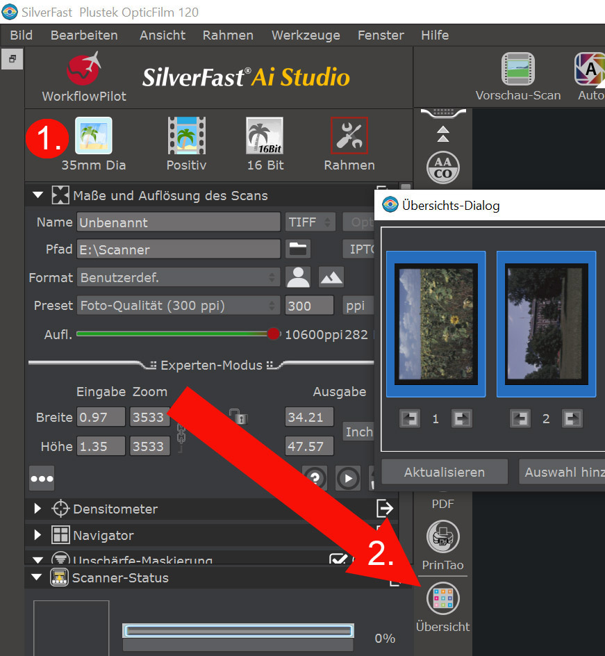 2. Wichtig: Sind mehrere Bilder im Filmhalter, wird zuerst auf 'Übersicht' geklickt und nicht auf Vorschau-Scan. Die Schaltfläche befindet sich in der mittleren Spalte ganz unten.