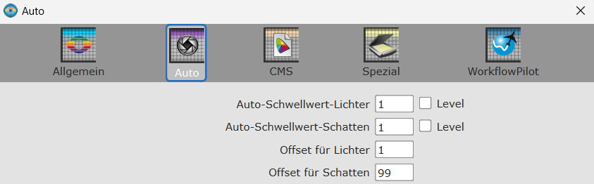 Die Auto-Schwellwerte für Lichter und Schatten stehen nach der Installation auf 2. Ich ziehe 1 vor in der Annahme, dass dadurch ein geringerer Beschnitt am Anfang und Ende des Histogramms erfolgt. Aus dem gleichen Grund ändere ich auch die Werte von Offset für Lichter und Offset für Schatten. Von LaserSoft Imaging wurde mir mitgeteilt, dass meine Änderungen die Gefahr von Farbstichen erhöhen. Probieren Sie es aus!