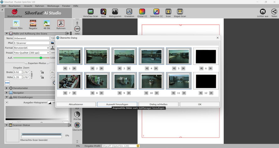 Danach erstellt SilverFast Ai Studio 9 einen Vorscan für den gesamten Filmhalter und sucht die einzelnen Bilder. Anschließend sind die relevanten Bilder zu markieren und werden mit 'Auswahl hinzufügen' dem JobManager hinzugefügt.