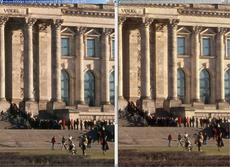 Das erste Bildpaar zeigt zwei Ausschnitte, die sich in punkto Schärfe und Auflösung kaum unterscheiden. In gleicher Weise hatte ich vorher die nicht reduzierte 7200 dpi Datei mit der Nikondatei verglichen. Sie sah genauso aus und die 7200 dpi bringen nicht mehr Details. Die Infrarotreinigung der Plustekdatei funktioniert bei 7200 dpi nicht so gut wie beim Nikon. Vor allem werden Störungen in relativ homogenen Bereichen weniger wirksam korrigiert. Bei 3600 dpi werden Schmutz und Kratzer effektiver beseitigt! .