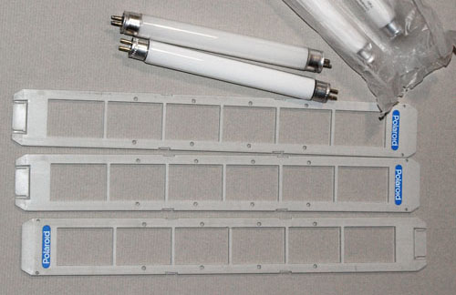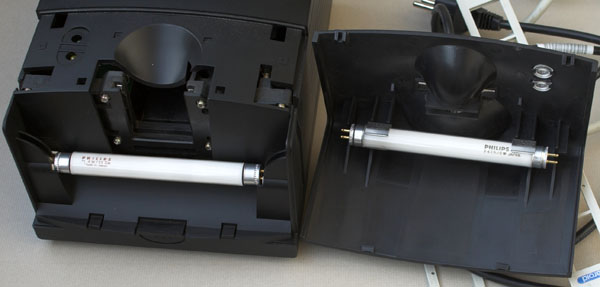 Die Vorlagen werden von einer Leuchtstoffröhre durchleuchtet. Unter der vorderen Klappe ist Platz für eine Ersatzlampe.