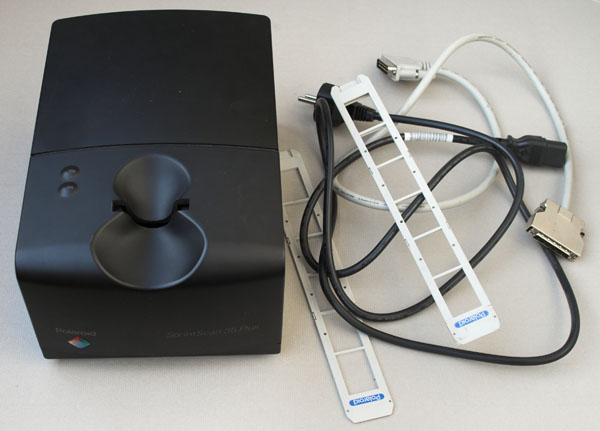 Polaroid SprintScan 35 Plus Scanner, Stromkabel, SCSI-Kabel und zwei Filmstreifenhalter.