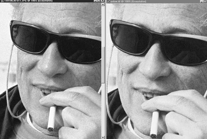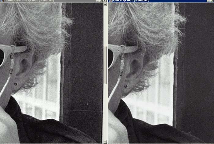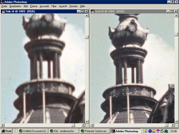 links: Scan mit Nikon Coolscan 4000 ED mit 4000 dpi (auf 2700 dpi runtergerechnet) / rechts: Scan mit Polaroid mit 2700 dpi
