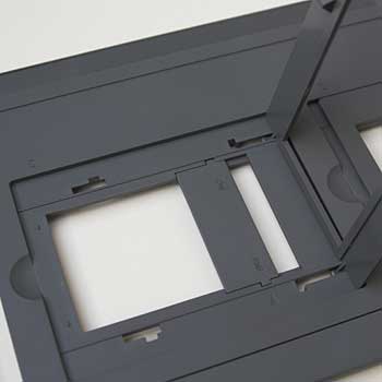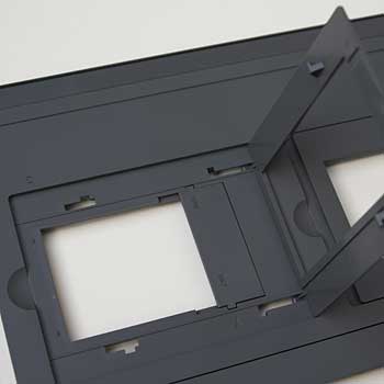 Vor dem Einsetzen der Filme sind Klappen zu öffnen, welche die Vorlagen nach dem Schließen stramm in den Rahmen halten.