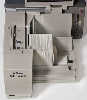 Der Slide Feeder ist ein Diamagazin mit automatischer Wechselfunktion. Er ist das wichtiges Zubehör für die Nikon Scanner LS-2000, LS-4000 und Coolscan 5000 für das schnelle Scannen von bis zu 50 Dias mit einer Ladung. Rahmen mit ca. 2mm Dicke und leicht gerundeten Seiten lassen sich im allgemeinen gut verarbeiten.Es gibt grundsätzlich zwei Scannertypen für automatische Serien-Scans von gerahmten Kleinbilddias. Einige Scanner sehen aus wie Diaprojektoren. Sie können Dias in den üblichen Standardmagazinen nacheinander digitalisieren. Der Nikon Slide Feeder wird dagegen mit einem Stapel Dias befüllt. Wenn man viele Dias hat, sollte dieser Unterschied bei der Anschaffung eines Filmscanners berücksichtigt werden. Lagern die Dias in Abodia-Archivschränken, in Journalen oder abheftbaren Hüllen, ist das Nikon System vorzuziehen. Für einige Tausend Dias in Magazinen wären andere Scanner günstiger, weil mit ihnen das Herausnehmen und Neubefüllen der Magazine entfällt.