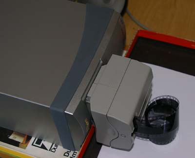Mein Scanner wurde so auf ein Regal gestellt, dass die Filme sowohl vorne als auch hinten lang herunterhängen konnten. Das war sinnvoll, damit sie nicht verkratzten oder auf einen staubigen Untergrund gerieten.