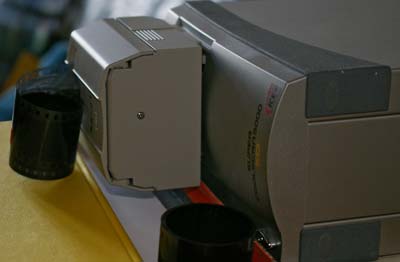 Der SA-21 wurde in den Nikon Coolscan 5000 eingesetzt und mit einem langen Schwarzweissfilm bestückt. Die Verabeitung klappte hervorragend. SilverFast und VueScan boten nun den gleichen Funktionsumfang wie beim SA-30. SilverFast zeigte nach einem Schnelldurchlauf bis zu 40 Vorschaubilder an. Das funktionierte prima. Beim ersten Test schickte ich fünf Filme (ca. 180 Bilder) nacheinander durch den Scanner. Die Arbeit wurde anstandslos erledigt. Es stellte sich heraus, dass der Scanner wie beim Einsatz des SF210 auf die Seite gelegt werden sollte. Vor die Ein- und Auslaßöffnungen des Scanners legt man Bücher oder etwas anderes bis zu ihrer unteren Höhe. Dadurch hängt der Film nicht runter sondern ringelt sich vor und hinter dem Scanner aufgrund seines Dralls zusammen.